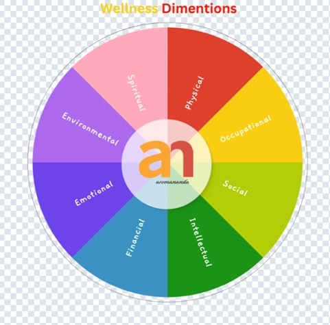 Aromananda Wellness embraces holistic well-being through balance across eight dimensions - physical, emotional, intellectual, social, spiritual, occupational, financial, and environmental.